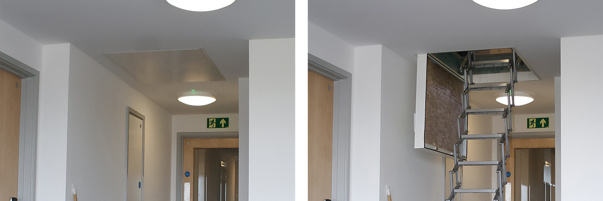 Alto Ceiling Hatches are finished in powder-coated white and can be over-painted to blend with the surrounding surface. The larger panels have full length piano hinges with the smaller panels using our unique pivot hinges. Alto Ceiling Hatches comply with all the building regulations for insulation, air tightness, L1 & L2, NHBC size requirements, robust documentation and are also fire rated.