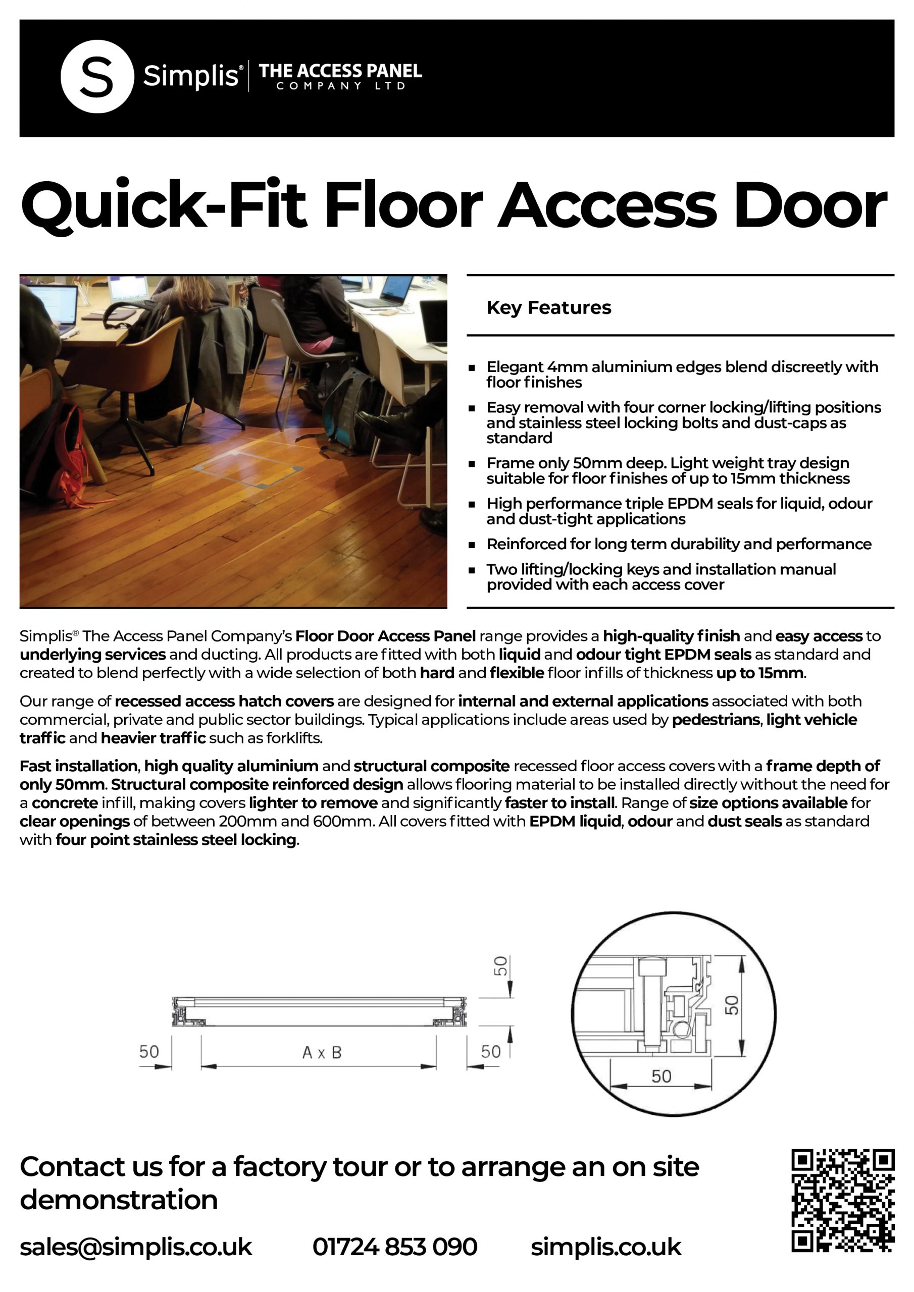 These Quick-Fit Floor Access Door panels are ideal for a range of environments. Including but not limited to: Shopping Centres, Offices, Hospitals, Schools, Leisure Facilities and Swimming Pools.