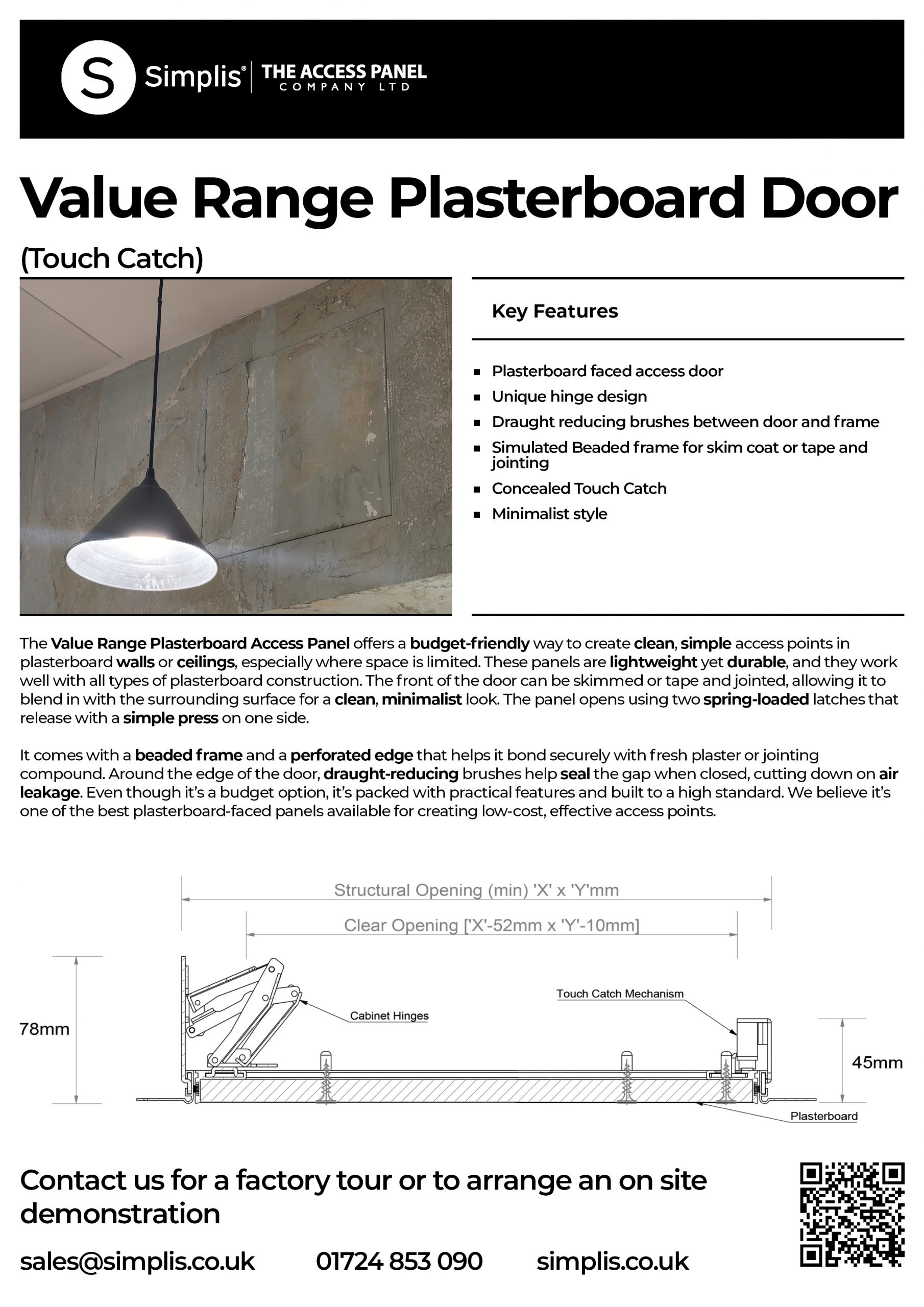 Value Range Plasterboard Access Panels provide very low cost plasterboard faced protected openings in ceilings and walls for access to building engineering services where space is at a premium.