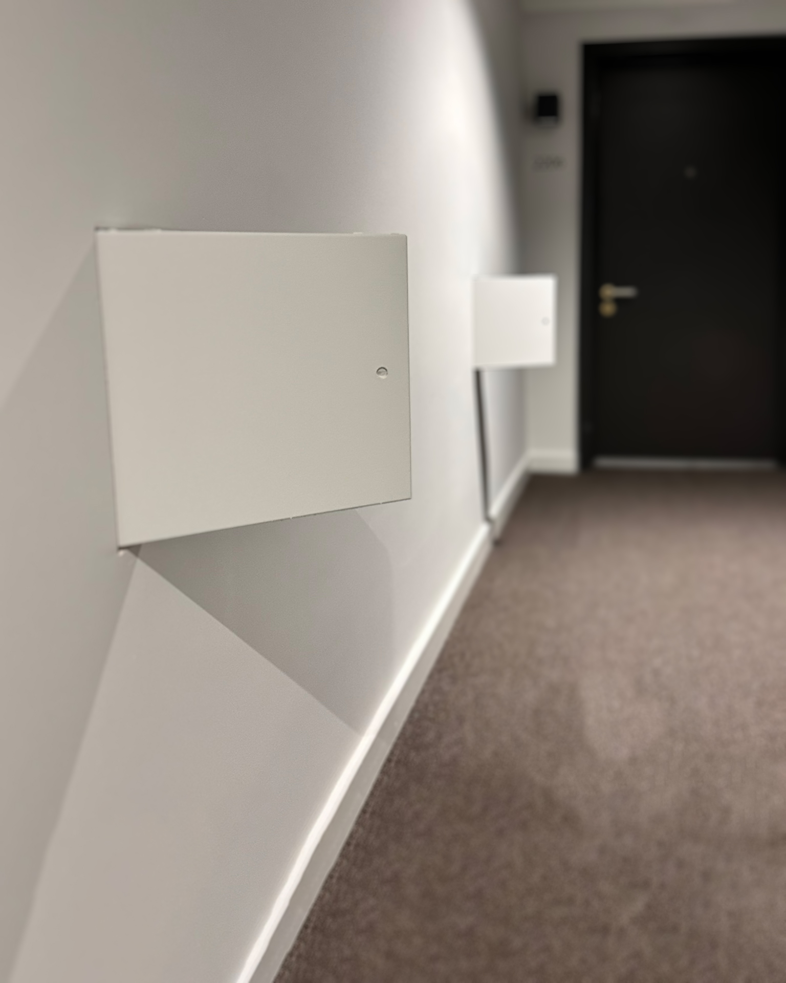 The doors are finished in powder-coated white and can be over-painted to blend with the surrounding surface. The larger panels have full length piano hinges with the smaller panels using our unique pivot hinges. The Premium Range Access Panel has the versatility to be specified with insulation, fire rating, acoustic reduction and a range of locking mechanisms.