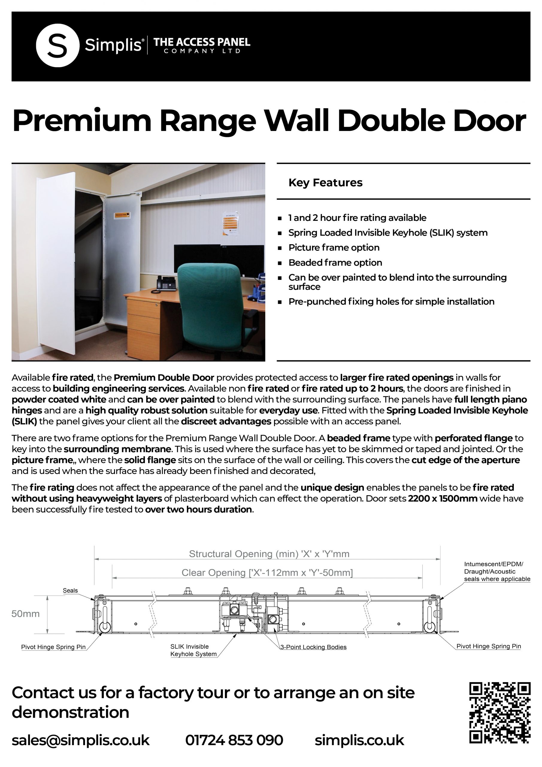 The doors are finished in powder-coated white and can be over-painted to blend with the surrounding surface. The panels have full length piano hinges. The Premium Range Wall Double has the versatility to be specified with insulation, fire rating, acoustic reduction and a range of locking mechanisms.